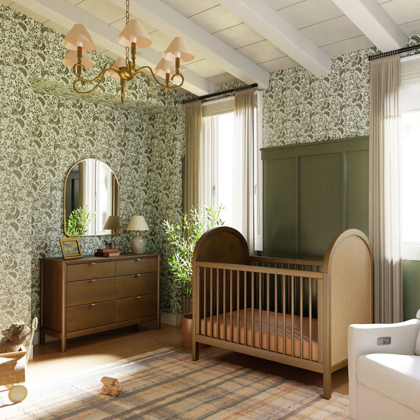 The Bondi Cane 3-in-1 Convertible Crib celebrates boho-inspired design and natural materials with its warm wood tone, playfully arched side panels, curved feet, and woven plant-based cane. The Bondi is designed to grow with your babe using an included toddler bed conversion rail and is screened for harmful chemical emissions to ensure it meets GREENGUARD GOLD Certification.