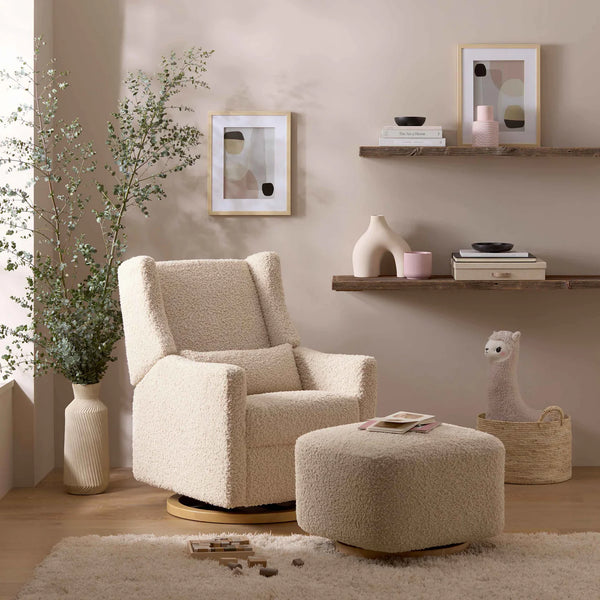 Kick up your heels and relax with the Kiwi Gliding Ottoman. Perfectly paired with the Kiwi Glider Recliner, this ottoman glides back and forth on a stylish, light wood base. Upholstered by hand in texture-rich teddy loop fabric, this trendy piece is a smart choice for feeding time with your babe.