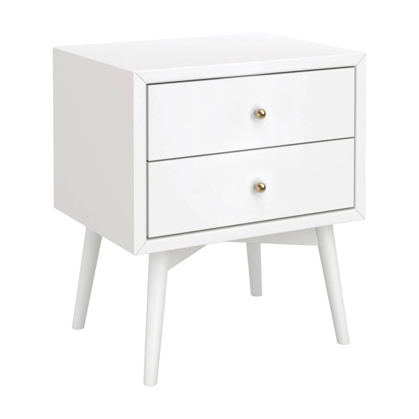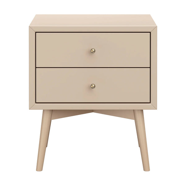The Palma Nightstand is a sophisticated mid-century inspired design with tapered legs, brushed metal hardware, and two smooth-glide drawers. Easy setup with minimal assembly required.
