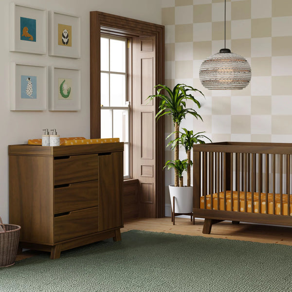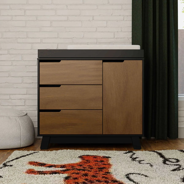 The Hudson 3-drawer Changer Dresser is a modern space-saving convenience! Combining an included changing table, 3-drawer dresser, and storage cabinet all in one versatile package. Truly built for baby, the storage cabinet includes an adjustable shelf which is perfect for keeping diapers and wipes handy. Additional details include smooth-glide drawers, hidden hardware, and an included anti-tip kit. Complement the best-selling Hudson 3-in-1 Convertible Crib for an essential modern nursery.
